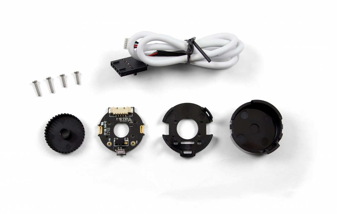 This simple and affordable quadrature-output encoder fits onto the rear shaft of a motor so its position and velocity can be monitored.