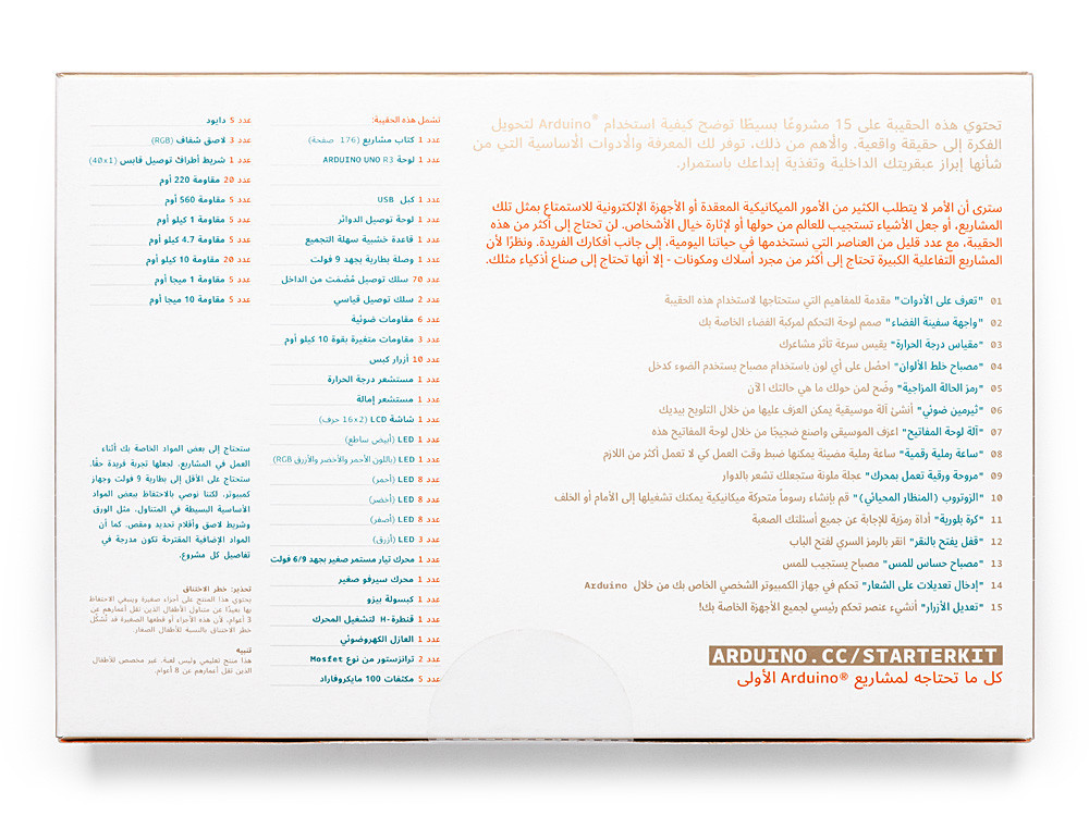 The Starter Kit walks you through the basics of using the Arduino in a hands-on way. You’ll learn through building several creative projects. The kit includes a selection of the most common and useful electronic components with a book of 15 projects. Starting the basics of electronics, to more complex projects, the kit will help you control the physical world with sensor and actuators.