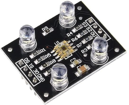 Designed around 4 White LEDs and the TAOS TCS230 sensor IC. The four white LED’s to provide a broad spectrum light source .The TCS230 has an 8 x 8 array of photodiodes with color filters (16 Red, 16 Blue, 16 Green, 16 Clear). A light to frequency converter generates a 50% duty cycle square wave on the output pin. Frequency is directly proportional to light intensity. Output scaling 100%, 20% and 2% allows for wide dynamic range of intensities. The color selects (S2, S3), frequency scale (S0, S1) and output are TTL logic level and can be connected directly to the micro controller. Basic readings are easy using the Arduino “pulsein” command. Take a reading for each color. The reading with narrowest pulse width or highest frequency is the major color. Using advanced ratio analysis almost any color could be recognized. Multiple uses by adding lenses, color filters, different light source.