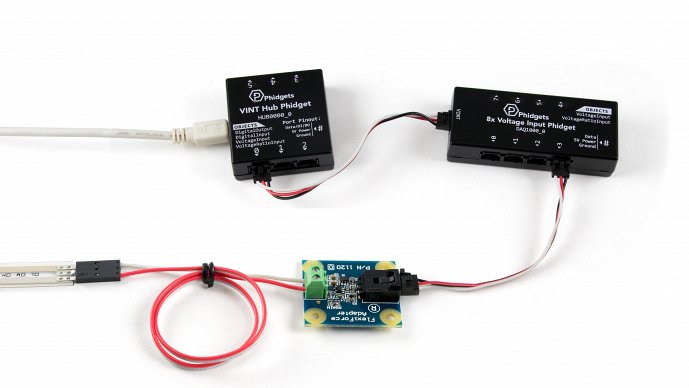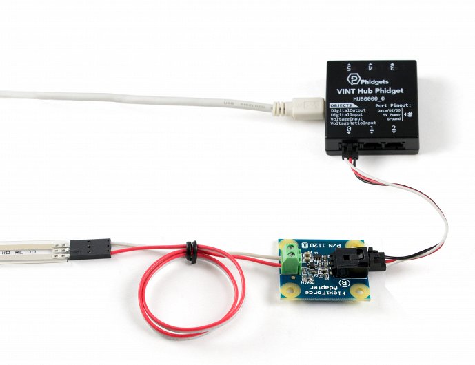 The FlexiForce adapter allows you to connect one FlexiForce FSR to a an Analog Input or VINT Hub port.
