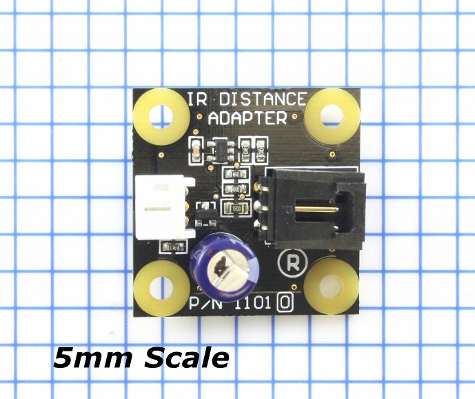 The IR Distance Adapter is designed to interface Sharp IR distance sensors to an Analog Input or VINT Hub Port. Any Sharp sensor with a supply voltage of 5V and an output voltage range falling within 0-5V is compatible with this adapter. The cable included with this adapter uses a JST S3B-PH connector, like the Sharp sensors sold by Phidgets Inc. If your Sharp sensor uses a different connector, you’ll need to find a matching cable for it.