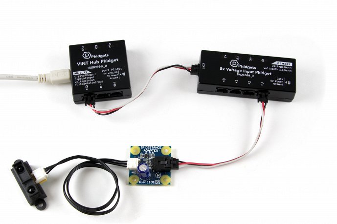 This adapter lets you read Sharp distance sensors with a Phidgets Analog Input or VINT Hub port.