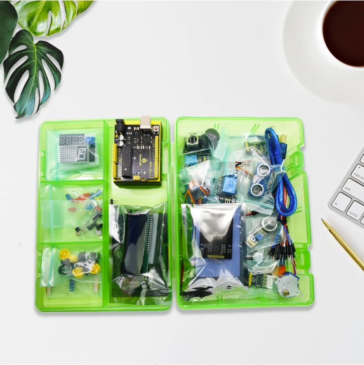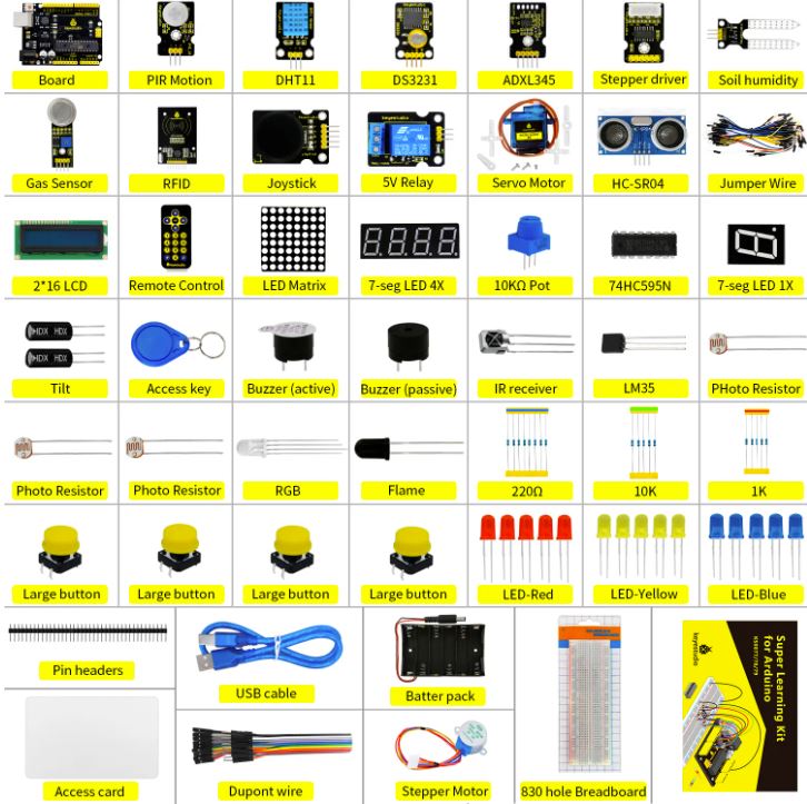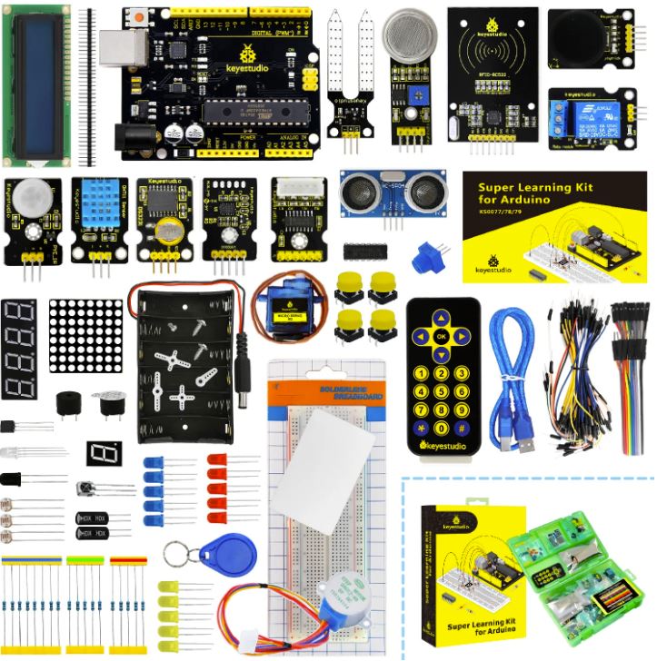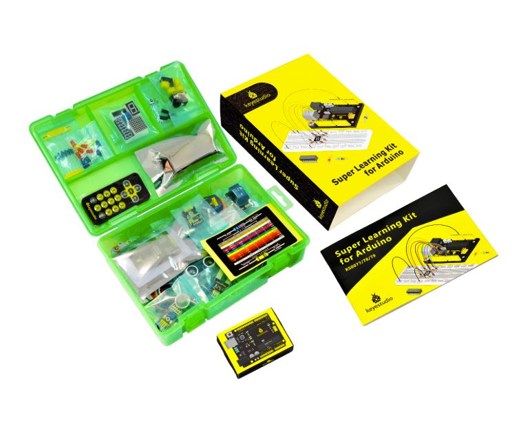 keyestudio super learning kit is suitable for Arduino enthusiasts. This kit includes 32 projects with detailed tutorials, starting from the basics to more complex projects.
