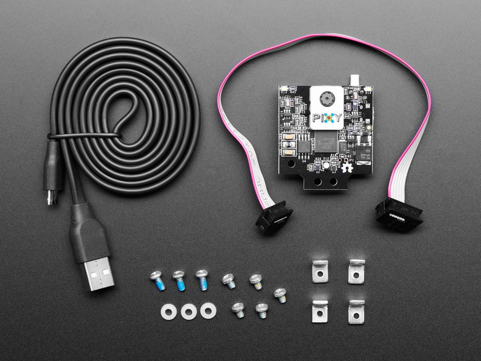 Each Pixy2 Sensor comes with a 6-pin-to-10-pin IDC cable, a USB to Micro USB cable, and mounting tabs and screws.