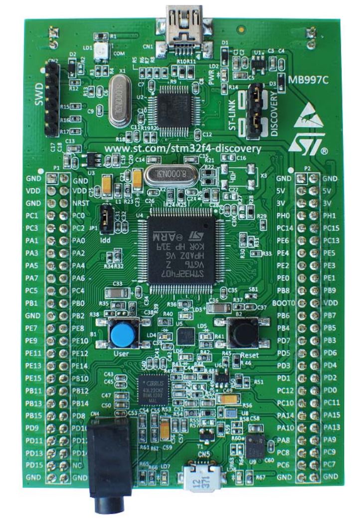 Based on the STM32F407VGT6, it includes an ST-LINK/V2 embedded debug tool, two ST MEMS, digital accelerometer and digital microphone, one audio DAC with integrated class D speaker driver, LEDs and push buttons and an USB OTG micro-AB connector.