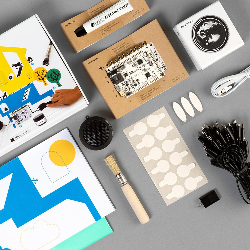 The Touch Board Starter Kit is the best kit for beginners looking to make an interactive project. With a Touch Board, Electric Paint, essential components, and step-by-step instructions you’ll have everything you need to turn any surface, object, or space into a sensor. No programming required!